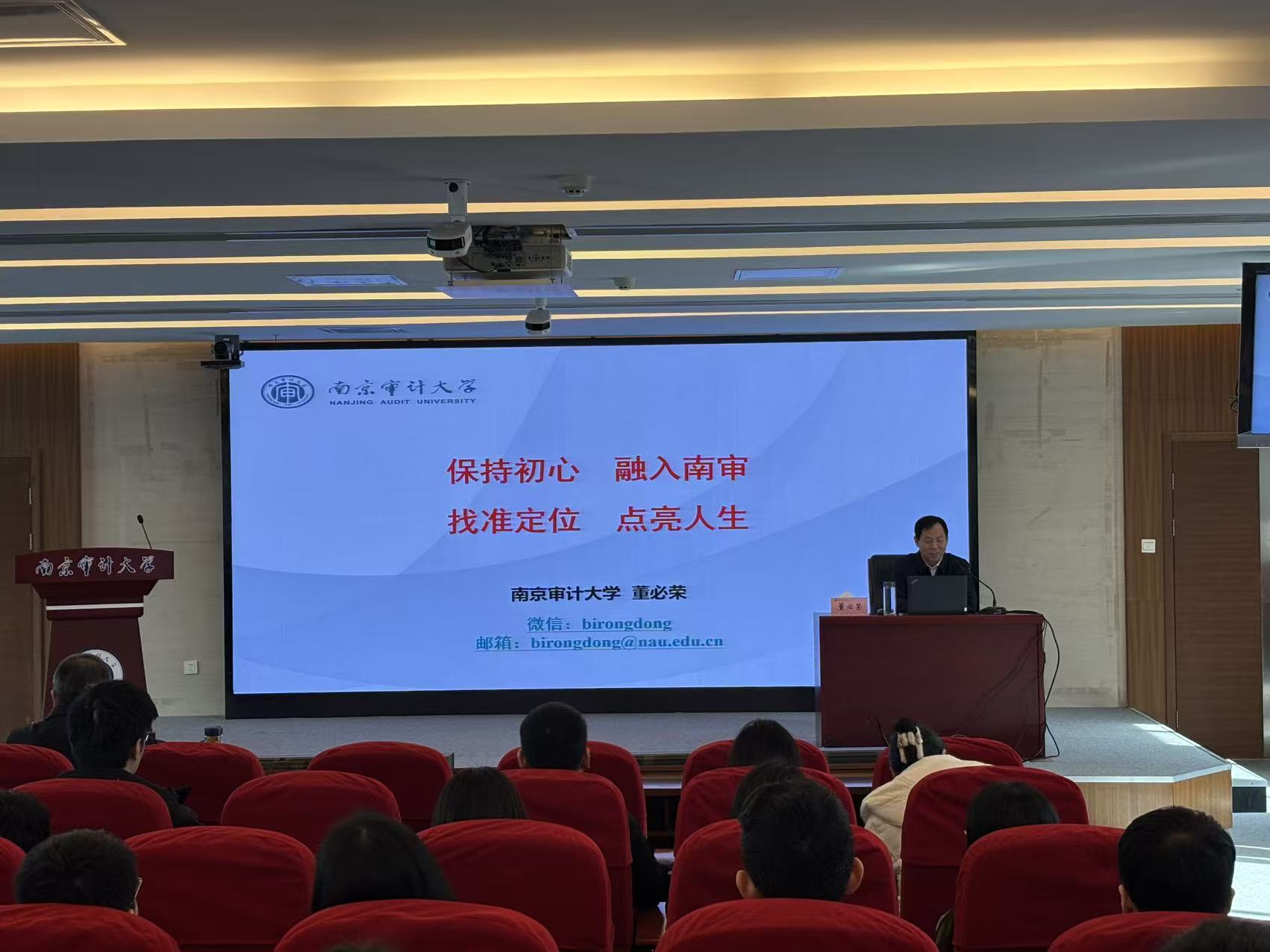 董必荣结合个人工作经历,围绕高校教师职业使命与成长路径,从五个方面深入阐述:一是如何认识教师职业,二是如何融入南审,三是如何观察世界和认识自己,四是处理好几个关系,五是怎样做一名合格的教师。他强调,新教师要做好以下几点:一是深刻认识教师职业,始终牢记教书育人第一职责,努力做“有理想信念、有道德情操、有扎实学识、有仁爱之心”的“四有”好老师。二是深入理解并践行学校“特色、质量、国际化”的办学理念,主动融入学院、学科、专业与南审文化,与学校发展同向同行。三是学会换位思考、理解包容,既要基于自身看世界,也要立足世界看自己。四是妥善处理好教书育人与科学研究、眼前利益与长远利益、工作与家庭的重要关系。五是树立正确世界观、人生观、价值观,自觉以习近平新时代中国特色社会主义思想为指导,提升专业素养、教育理论水平与政策敏锐度,紧跟学科前沿,把握学生特点,找准好自己在南审定位,实现个人与学校共同发展。